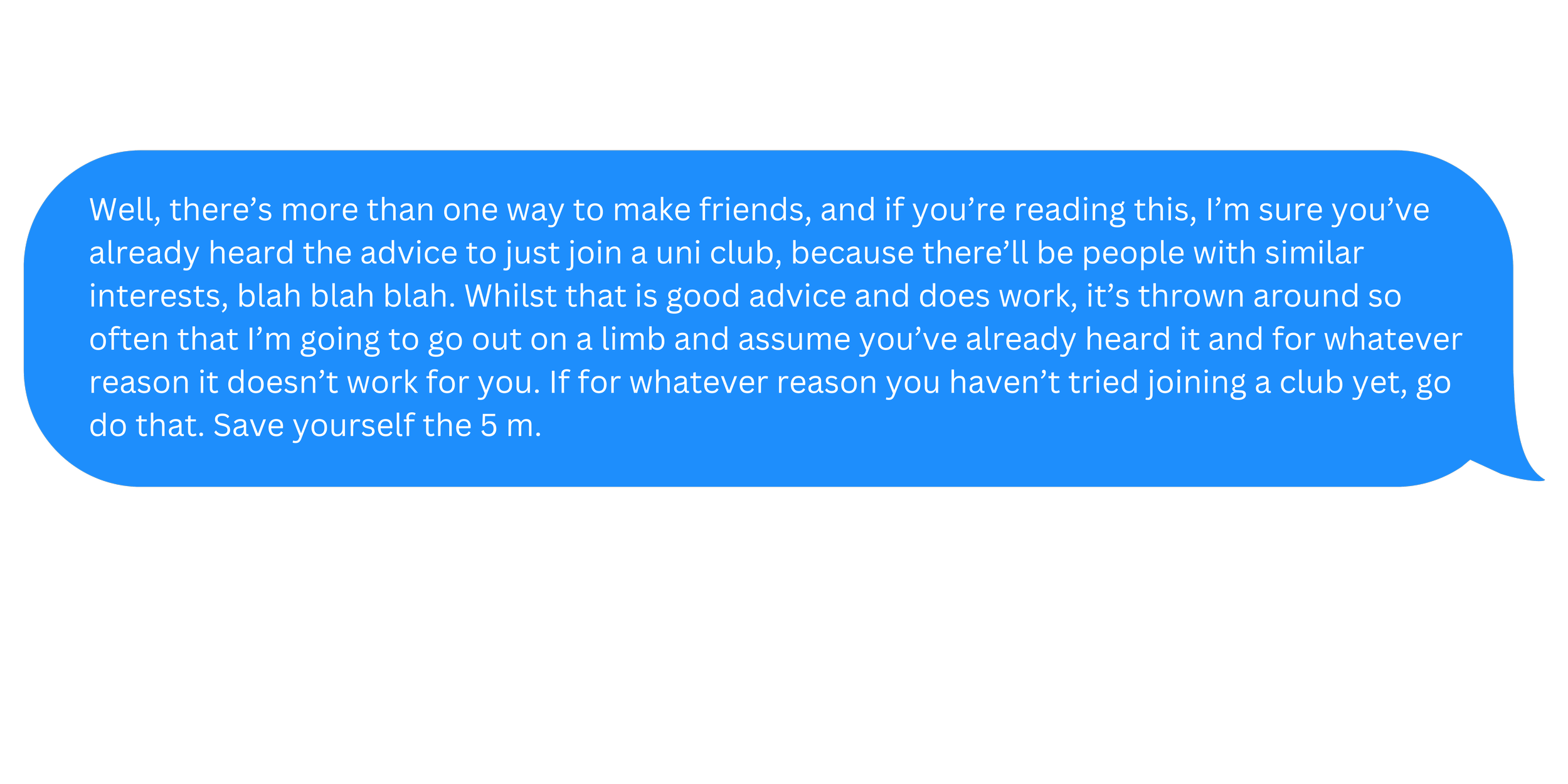 Again, this is just my experience, but I did come into University as an introverted 20 year old first year, without a single friend in my course, and I can happily say in the most humble way possible, I’ve been lucky enough to develop a myriad of fulfilling friendships in just under a year. Pretty much, show your personality, initiate meet ups, recognise when someone has room for friendship and don’t be scared to make the first move (Damn, sounds an awful lot like dating advice). But I hope this short guide provided some insight, and will be useful to some of you guys at least.