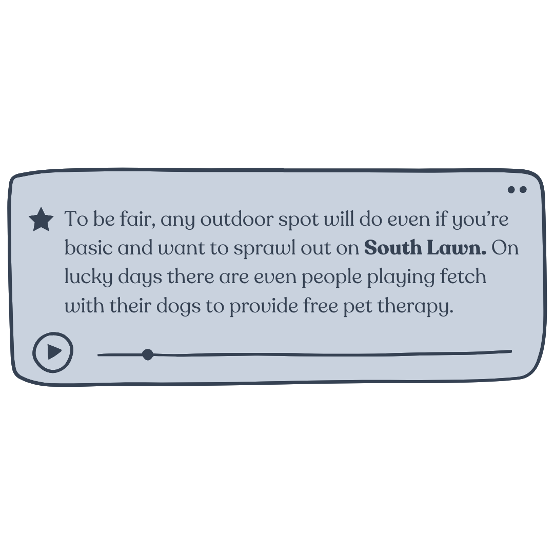 There’s just something about basking in the sun that is so grounding; giving a much-needed mood boost and regulating overthinking. Focus on the pretty flowers and fallen leaves, the breeze, and take a deep breath of fresh air instead of the stuffy library air.